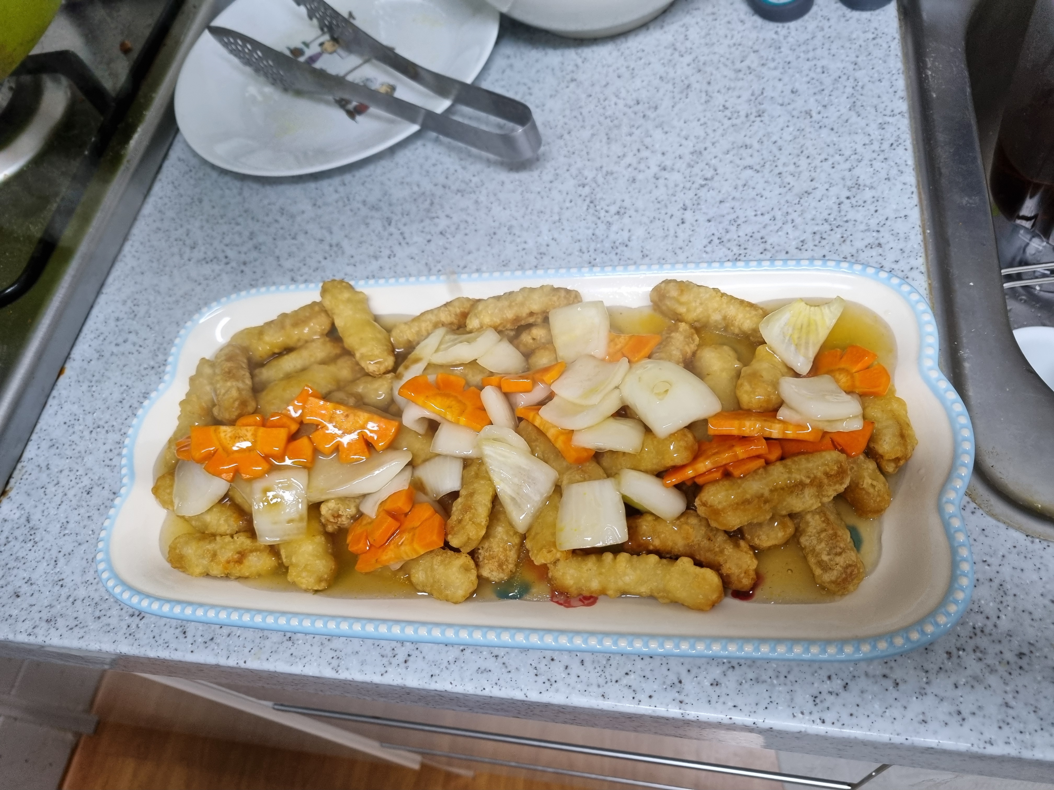 탕수육 만들기 레시피를 찍었는데 사진이 너무 많아서 소스만 먼저 따로 올릴게요 재료 당근, 양파,소금 물500ml, 전분 1T, 간장 1T, 식초 2T, 설탕 3T 조리 전체과정 베이스1 : 당근, 양파를 썰어 놓는